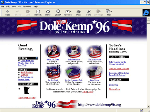 باور کنید یا نه، اینترنت از سال 1996 در انتخابات ایالات متحده نقش داشته است. در آن سال همه نامزدهای ریاست جمهوری وب سایت هایی ایجاد کردند، و بله، آنها شبیه وب سایت هایی بودند که در دهه 90 با مرورگرهای پیشرفته نت اسکیپ و اینترنت اکسپلورر ساخته شده بودند. در آن زمان هیچ کرومی وجود نداشت که بتوان از آن صحبت کرد، فایرفاکس، سافاری، و اپرا اولین تولد خود را در سال 1996 جشن می گرفت. در سال 1996، اینترنت مانند امروز بر رای دهندگان تسلط نداشت – این یک شی جدید و درخشان بود. باید آزمایش شود – عمل واقعی هنوز در تلویزیون، رادیو و روزنامه ها بود.