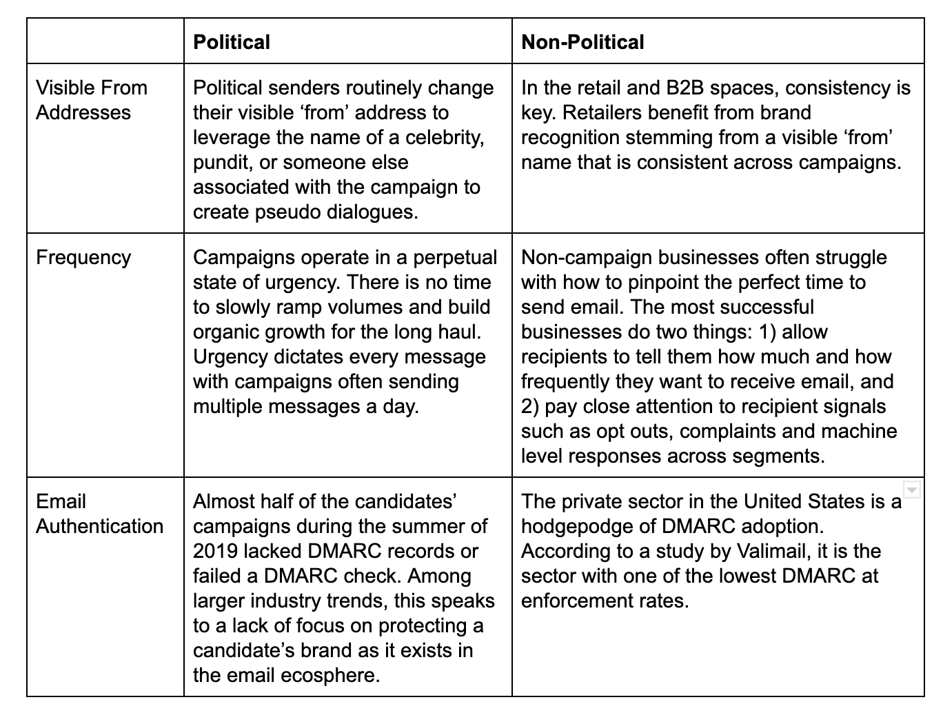 ما دریافتیم که تاکتیکهای مرتبط با ایمیل خوب در فضای خردهفروشی به نظر نمیرسد در فضای سیاسی کاربرد داشته باشد. برعکس، کمپینها از نقطه نظر فوری عمل میکنند و تعداد باورنکردنی هنجارها را زیر پا میگذارند: