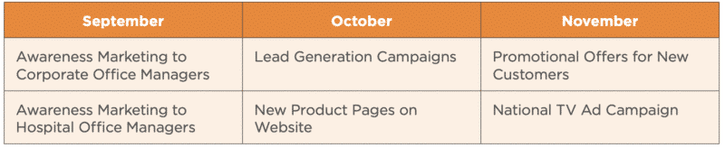 سه تحویل کلیدی وجود دارد که باید از برنامه ریزی فصلی حاصل شود: اهداف بسیار مهم (WIG)، نقشه راه بازاریابی و طرح های عقب مانده. اینها همه مواردی هستند که باید کل بخش بازاریابی را دربر گیرند و همه تیم ها را در بر گیرند.