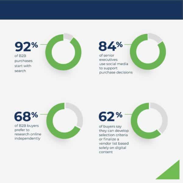 در سال 2017، میتوانید با هدف قرار دادن یک یا دو خریدار در سناریوهای خرید شرکت کنید. اکنون، کمیتههای خرید با دو نفر تنها 18 درصد از خریدها را تشکیل میدهند، در حالی که اکثر آنها پنج نفر یا بیشتر. این افراد به دنبال راهحلهایی آنلاین هستند و بهطور فزایندهای آنها را در کانالهای اجتماعی پیدا میکنند — فروشندگان اجتماعی B2B از همتایان خود که از رسانههای اجتماعی استفاده نمیکنند تا 72% عملکرد بهتری دارند.